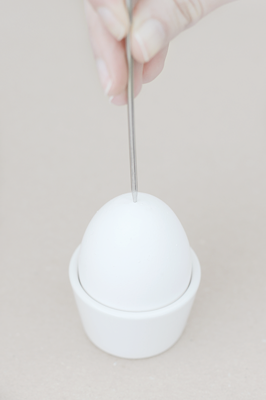 Dann piekst ihr dort, wo später die Aufhängung hinkommen soll, ein kleines Loch in die Eierschale. Um das Loch zu vergrößern, nehme ich einen Schaschlikspieß und drehe ihn vorsichtig. Es genügt, wenn das Loch ungefähr den Durchmesser des Spießes hat.