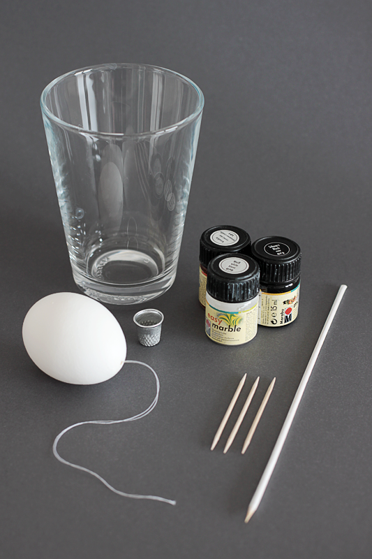 ihr eurem Osterstrauch auch ein bisschen Marmor verpassen wollt, braucht ihr ein Gefäß, in dem das Ei bequem eingetaucht werden kann (z.B. ein großer Joghurtbecher). Außerdem benötigt ihr Marmorierfarben, kleine Näpfe zum Mischen der Farben, Zahnstocher und ein Stäbchen, das durch das kleine Loch eures Eies passt. Mit dem Stäbchen wird das Ei später untergetaucht, während ihr es gleichzeitig an dem Faden haltet. Nicht