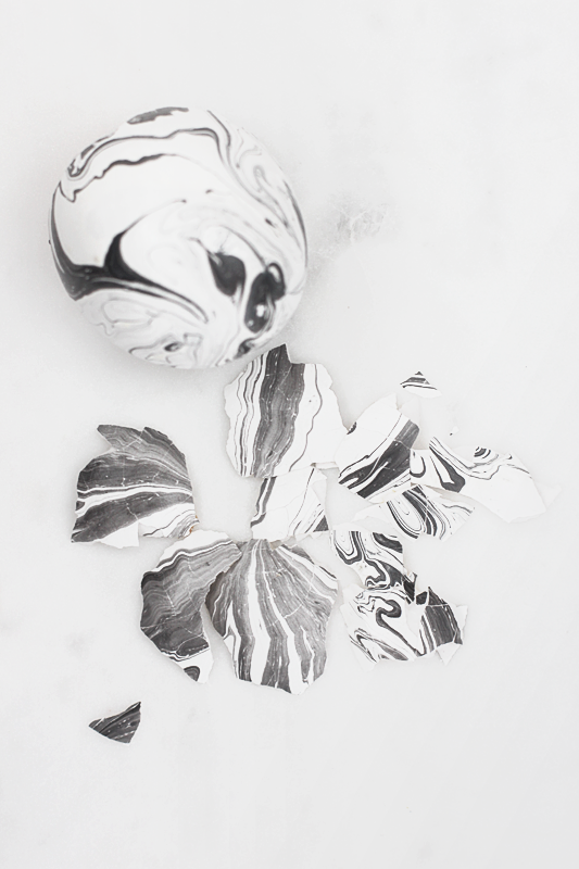 Im letzten Jahr gab es schwarz-weiße Muster, in diesem Jahr werden die Ostereier marmoriert. Hört sich erst mal schlimm an, weil man an viel zu viel Farbe und noch mehr Farbkombinationen denkt. Aber das Ganze geht auch in ‚dezent‘. Bei mir hat der Marmor jedenfalls einen echten Stein im Brett!